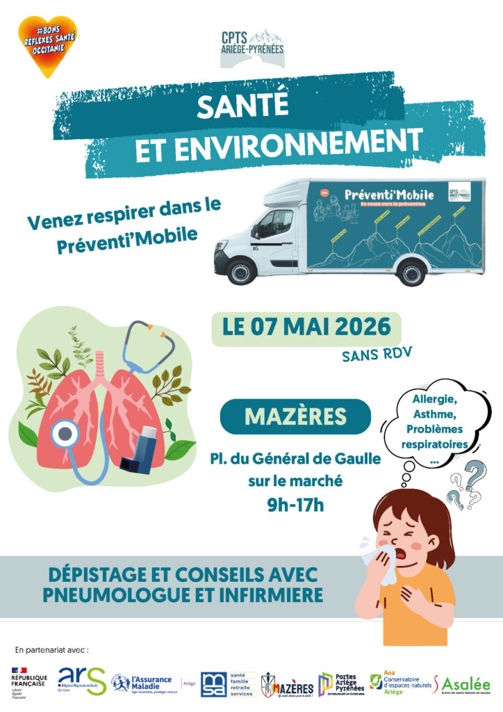Le 7 mai 2026, retrouvez-nous de 9h à 17h à Mazères, place du G. de Gaulle (sur le marché), à l’occasion de la nouvelle édition de « Mai Poumons », organisée par la CPTS Ariège-Pyrénées !