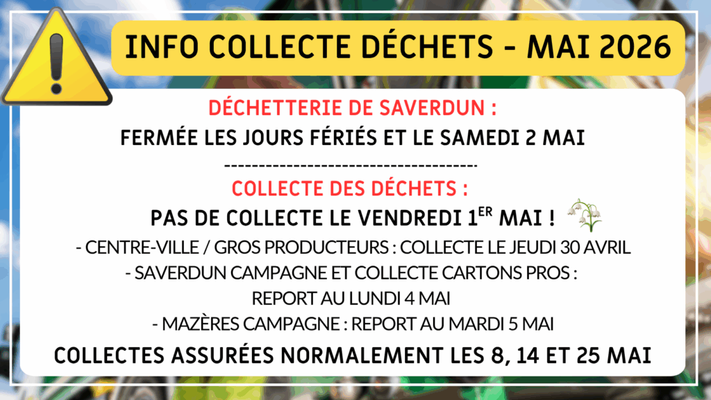 La Communauté de communes des Portes d’Ariège Pyrénées (CCPAP) informe les habitants des ajustements liés aux jours fériés du mois de mai 2026 concernant la collecte des déchets qu’elle assure sur les communes de Brie, Canté, Labatut, Lissac, Mazères, Montaut, Saint-Quirc, Saverdun et l’accès à la déchetterie de Saverdun.